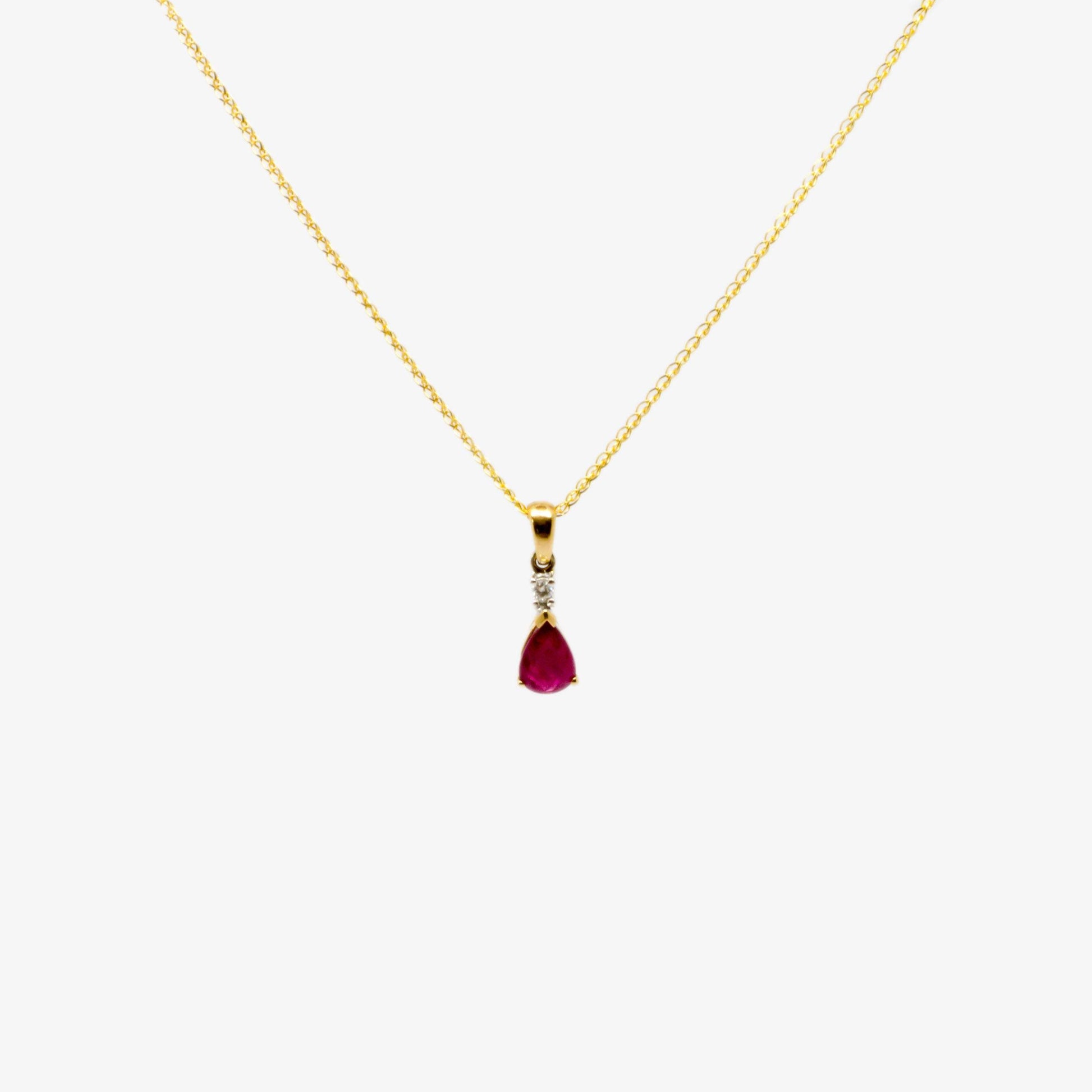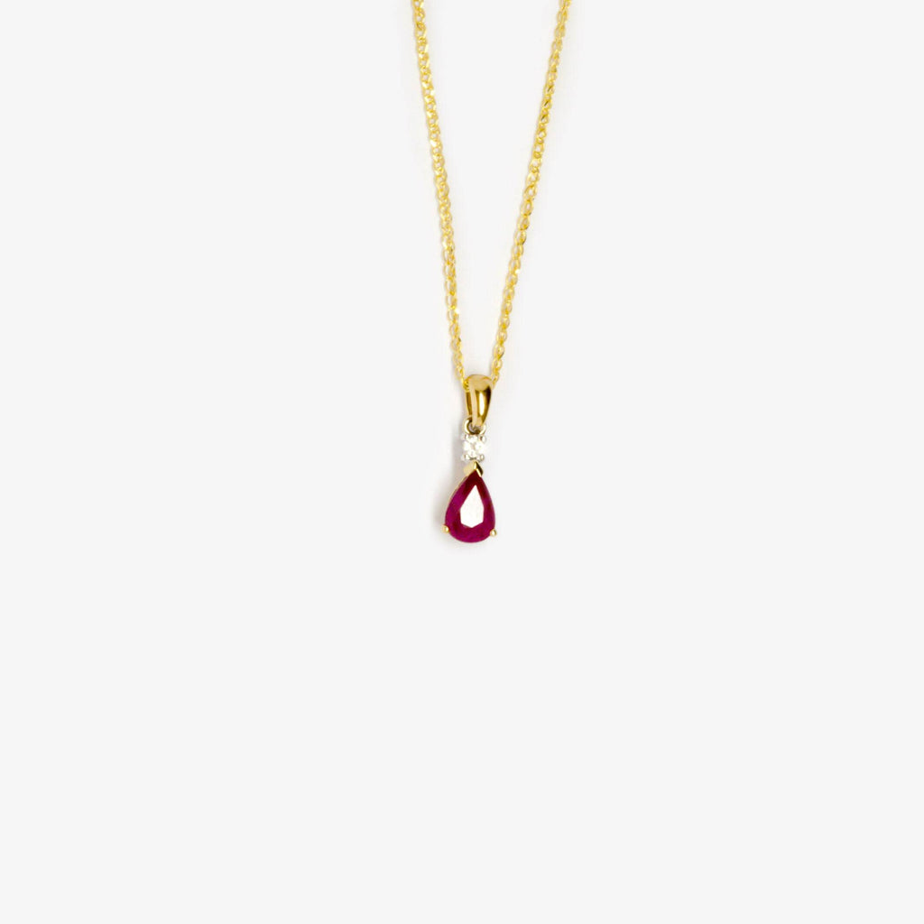 Necklace in yellow gold with a teardrop ruby pendant in the middle and a diamond on the top of the teardrop.