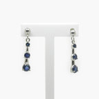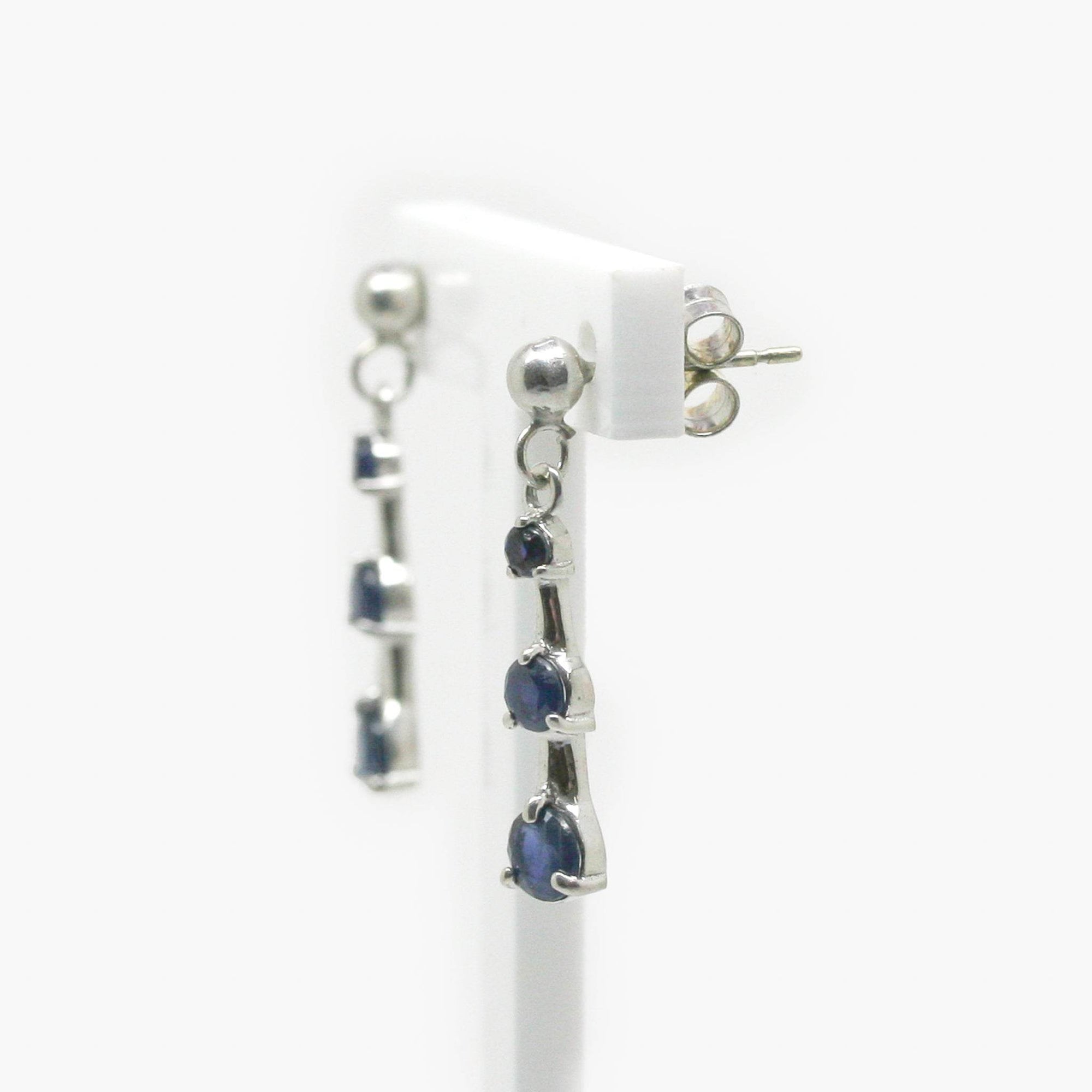 Earrings in 9ct white gold with a triple sapphire drop with the sapphire getting bigger in size.  The sapphires are in a claw setting. The earrings are on post with butterfly backs. They weigh a total of 1.5g and the drop length is 2.2cm.
